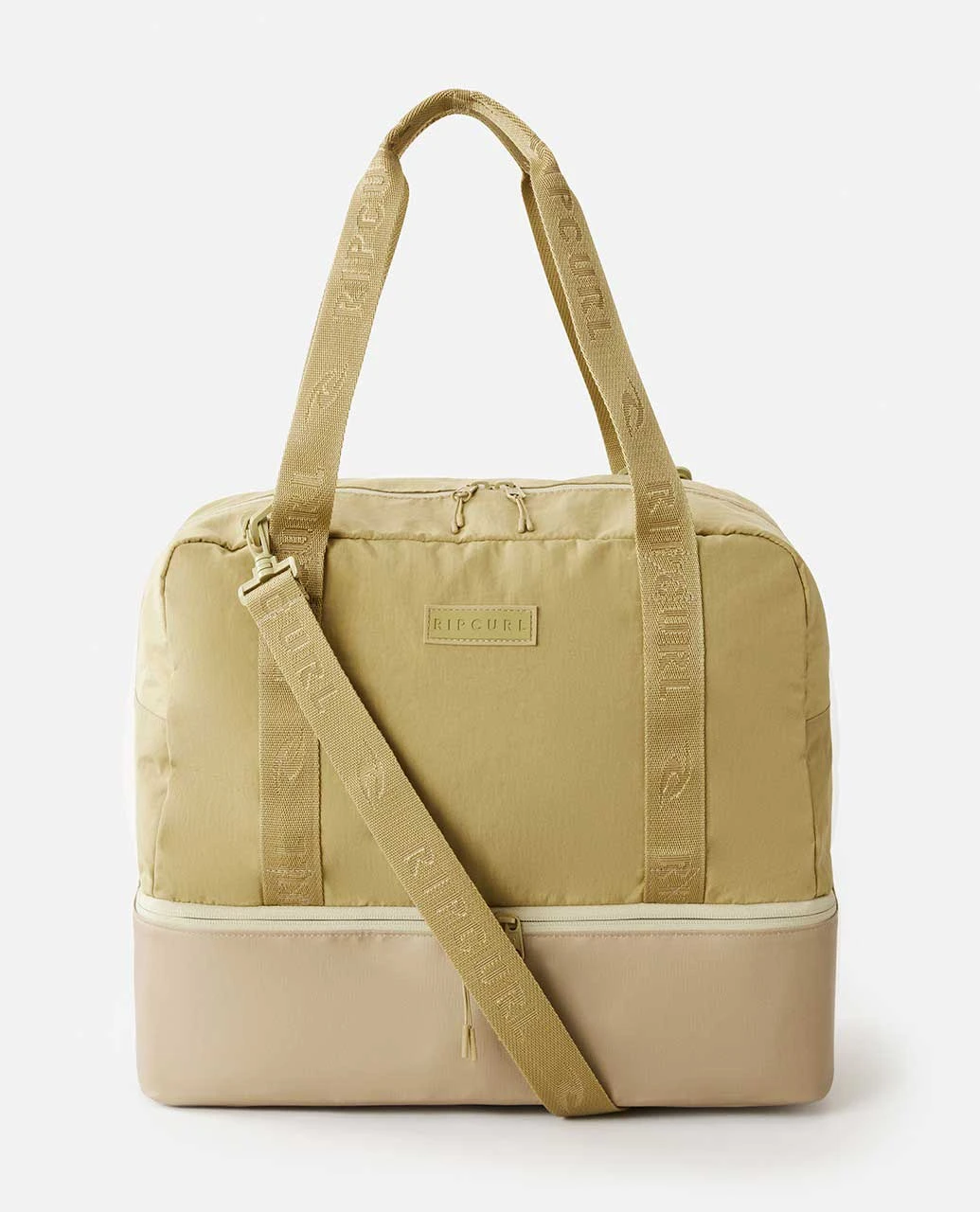 Travel in style with the Coastal Sun 43L Duffle Bag. This oversized travel bag features a zipper closure for secure storage. With multiple sections and an internal pocket, it offers ample space to organize your belongings. The silicon badge adds a touch of coastal-inspired charm, while the external zip pocket/separate shoe pocket provides convenient access to essentials.