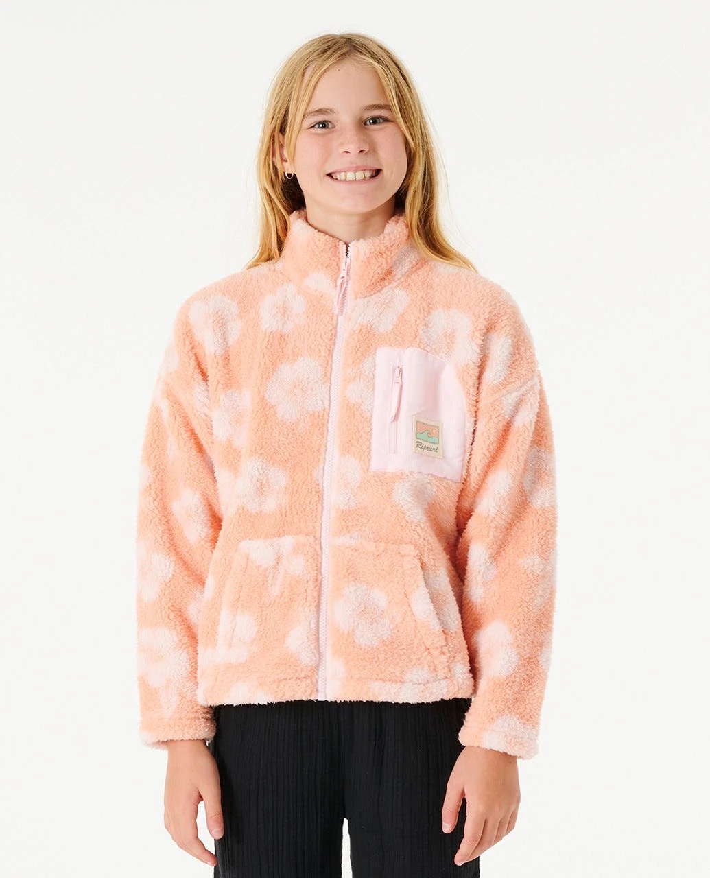 The Desert Waves Polar Fleece is a rad cosy girl’s pullover jumper. This epic sweater has a fun floral design, front pocket, kanga pocket, and front zip.