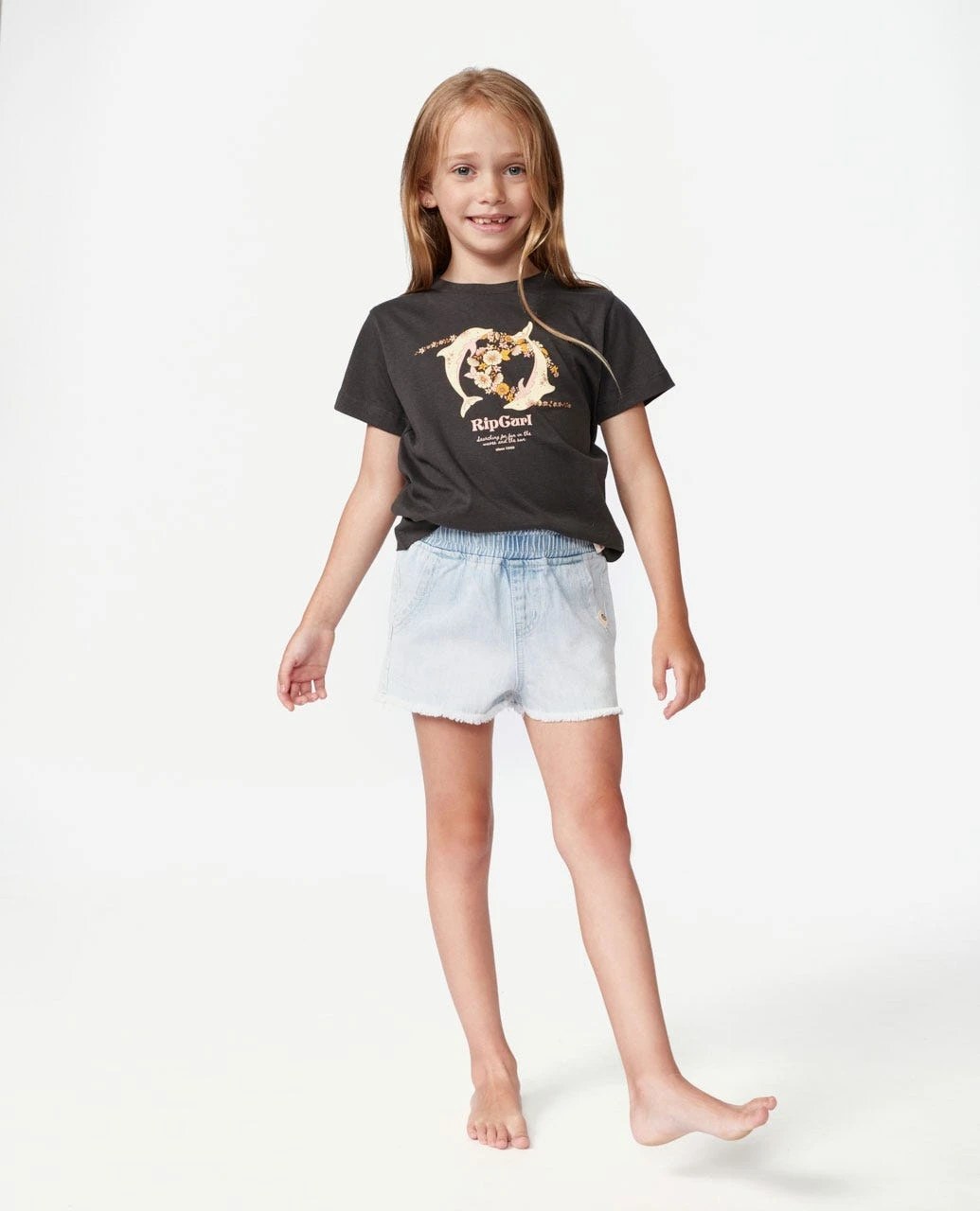 The Dolphin Tide Tee is a stylish and comfortable choice for younger girls. With its front print, it adds a trendy and playful touch to their outfit. The woven clamp adds a stylish detail to the tee. Crafted with care, it offers both comfort and durability. Whether they’re going to the beach, park, or any other casual occasion, the Dolphin Tide Tee is a versatile option that allows them to express their unique sense of style effortlessly.