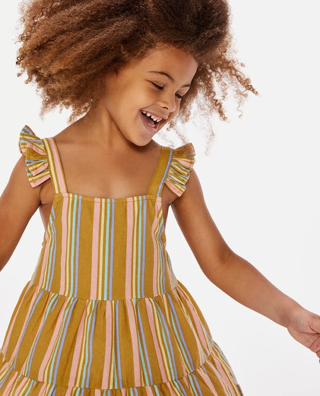 The Dreamer Stripe Dress is a fun dressier girl’s style featuring a pretty 70s stripe print all over, with sleeve frill details and a mid length. Designed in a relaxed fit for a flowing comfortable result.