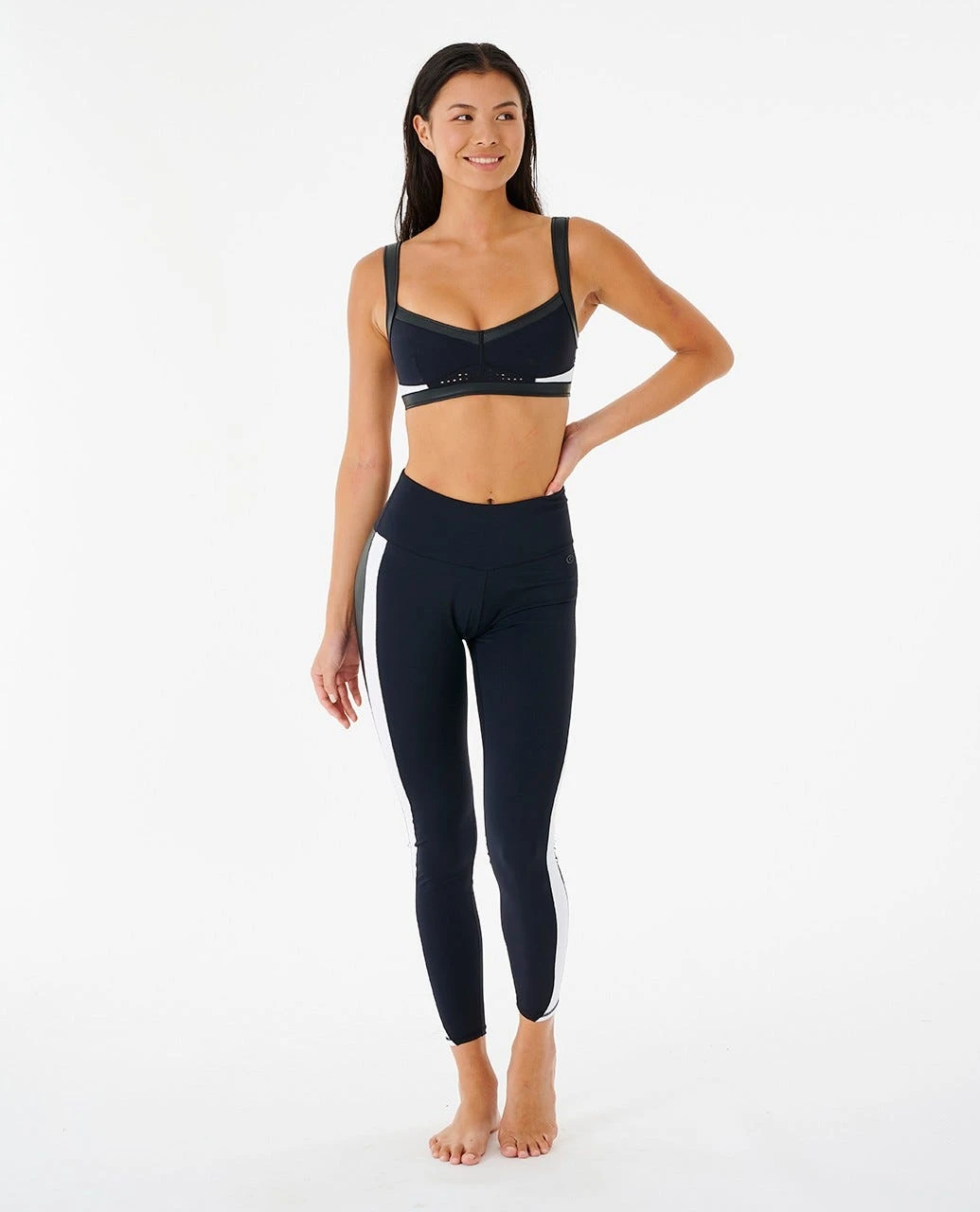Features: Made with ECONYL® Regenerated Nylon, UPF 50+, High rise, Full coverage, Coated neoprene panels, High density heat transfer logos, E-Stitch detail, Contrast binding, Internal power mesh for support.