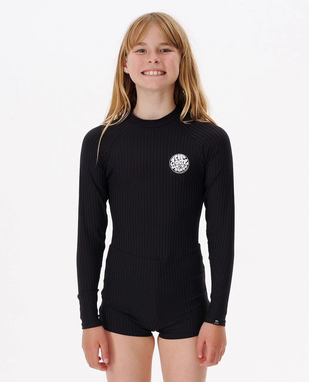 The Premium Surf Long Sleeve Boyleg UV Surfsuit is a great girl’s one piece swimsuit designed for surfing. Made from a textured wide flat rib fabric, in a full coverage standard fit for all day comfort and confidence. Featuring an excellent sun protection rating of UPF 50+.