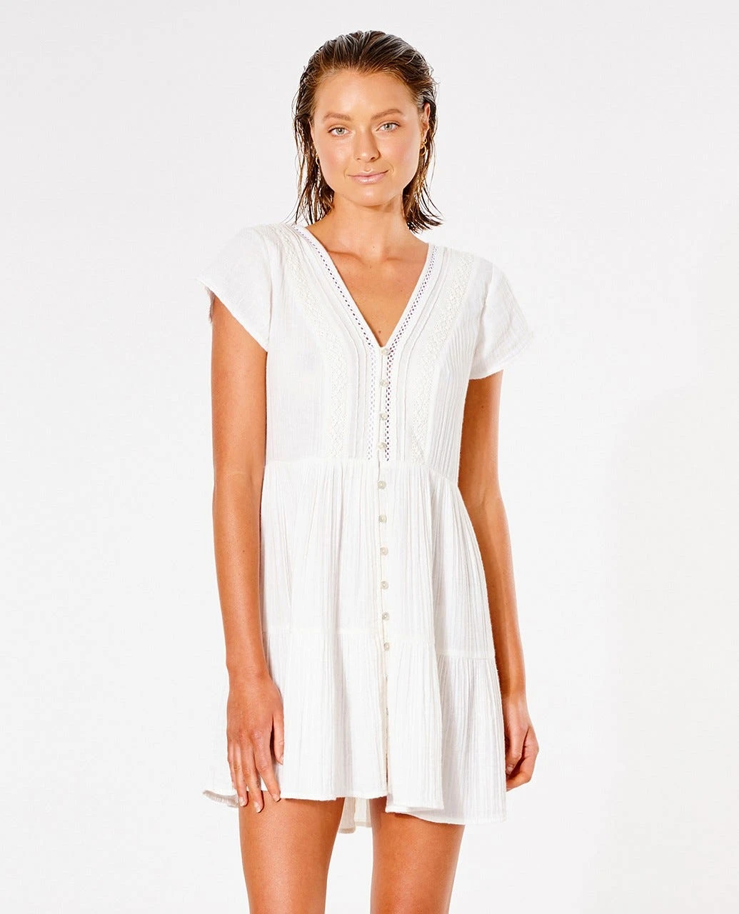 The Summer Breeze Dress is a great women’s button through style perfect for hot summer days and nights. Featuring tie back detail, crotchet trim, V-neck and capped sleeves.