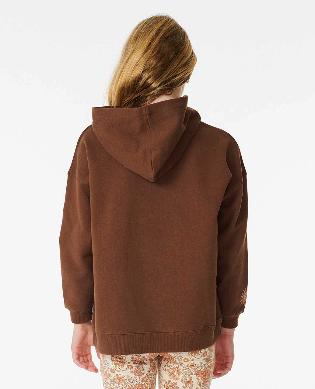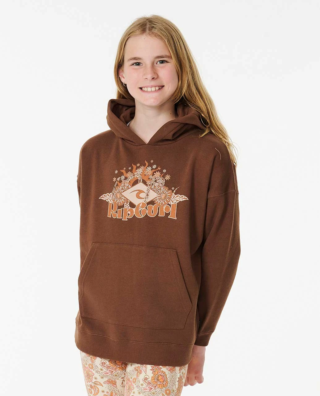 The Sun Catcher Hood is a cozy and stylish option for girls aged 8 to 14 years. Made from cotton poly fleece fabric, this hooded sweatshirt offers a relaxed fit for comfort. The stone wash gives it a cool and worn-in look, while the front and sleeve print add a fashionable design. With a woven flag label and a kanga pocket for added detail and functionality, this hooded sweatshirt is perfect for casual and laid-back outfits.