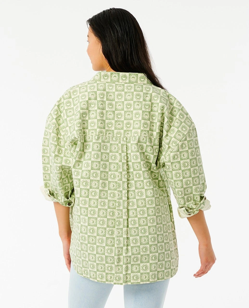 Stay stylish and cozy with the Sunburst Shacket. Made from a soft cotton twill peached material, this shacket is a stylish layer piece that is super versatile. The heavy stone wash gives it a rugged, vintage look, and the oversized fit provides a comfortable, relaxed feel. The front pocket and all-over yardage print with checkered surf and sun icons add a playful touch, while the metal snap buttons provide a secure closure. So whether you’re running errands or throwing it on for a night out, the Sunburst Shacket is the perfect addition to your wardrobe.