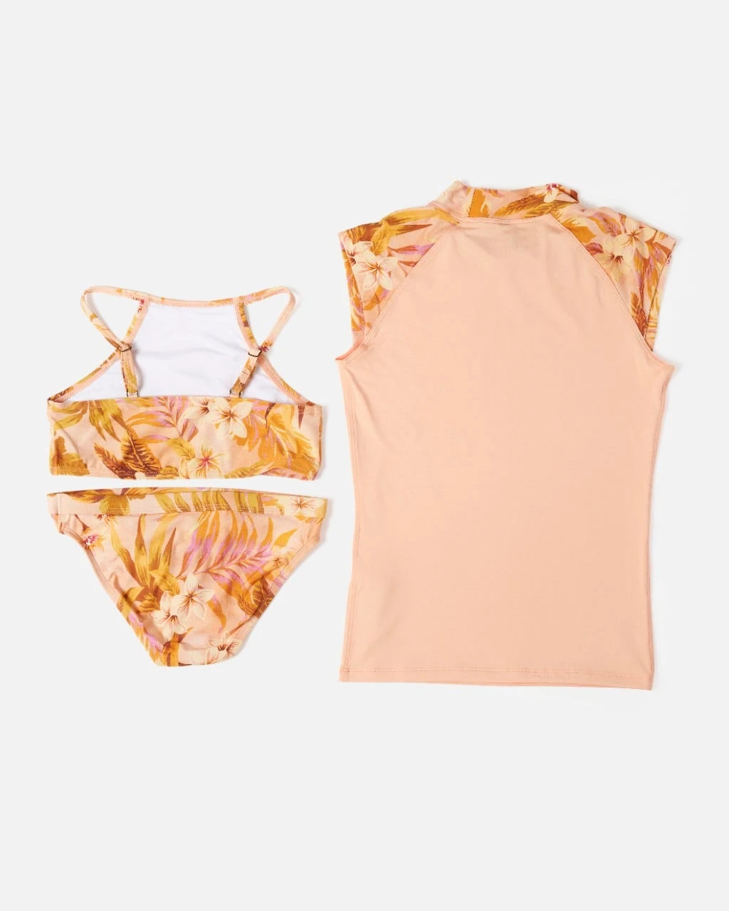 The Sunday Swell Long Sleeve Rash Set is a great complete swim outfit for girls. Featuring long sleeve rash vest, crossback bikini top, and full coverage bikini pant in matching tropical yardage print.