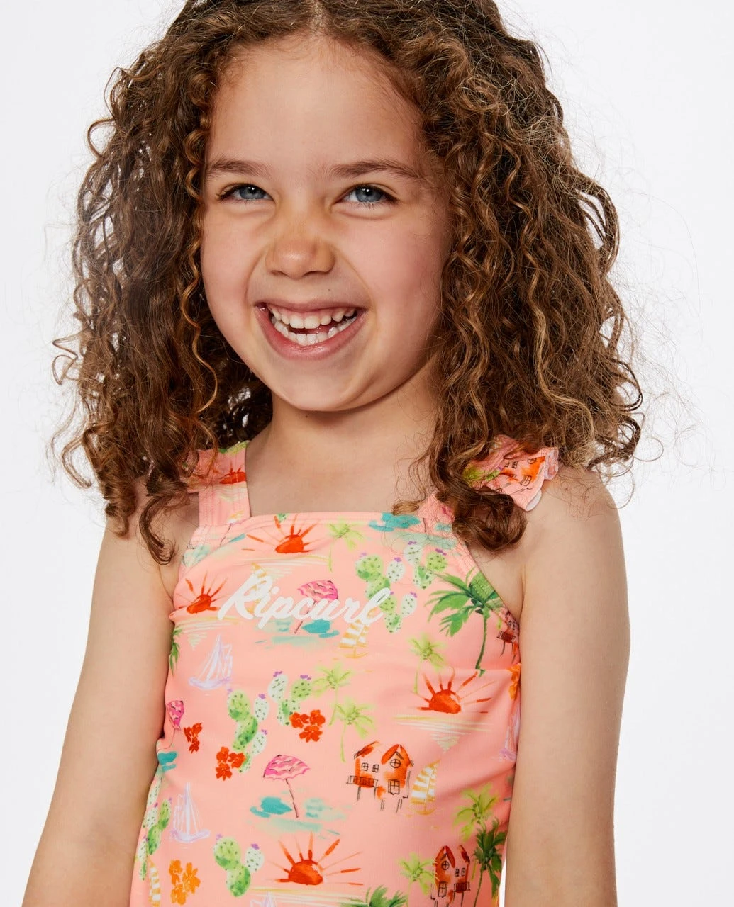 The Vacation Club is an epic girl’s tankini set made from Extra Life Microfibre Lycra that gives long-lasting comfort, fit and shape with no bagging or sagging. Featuring a peachy tones and florals, it’s fully lined, and has frilly shoulder details.